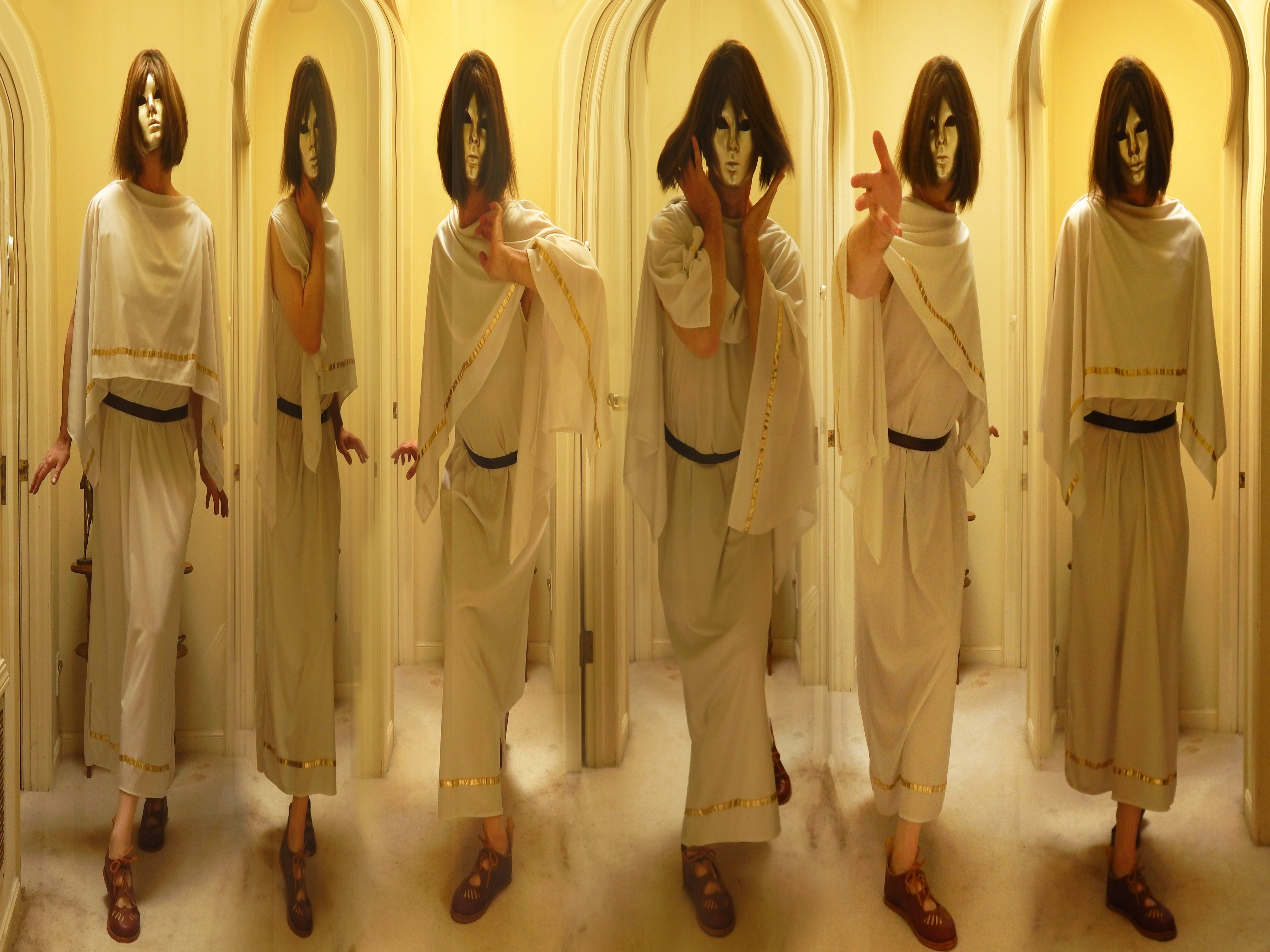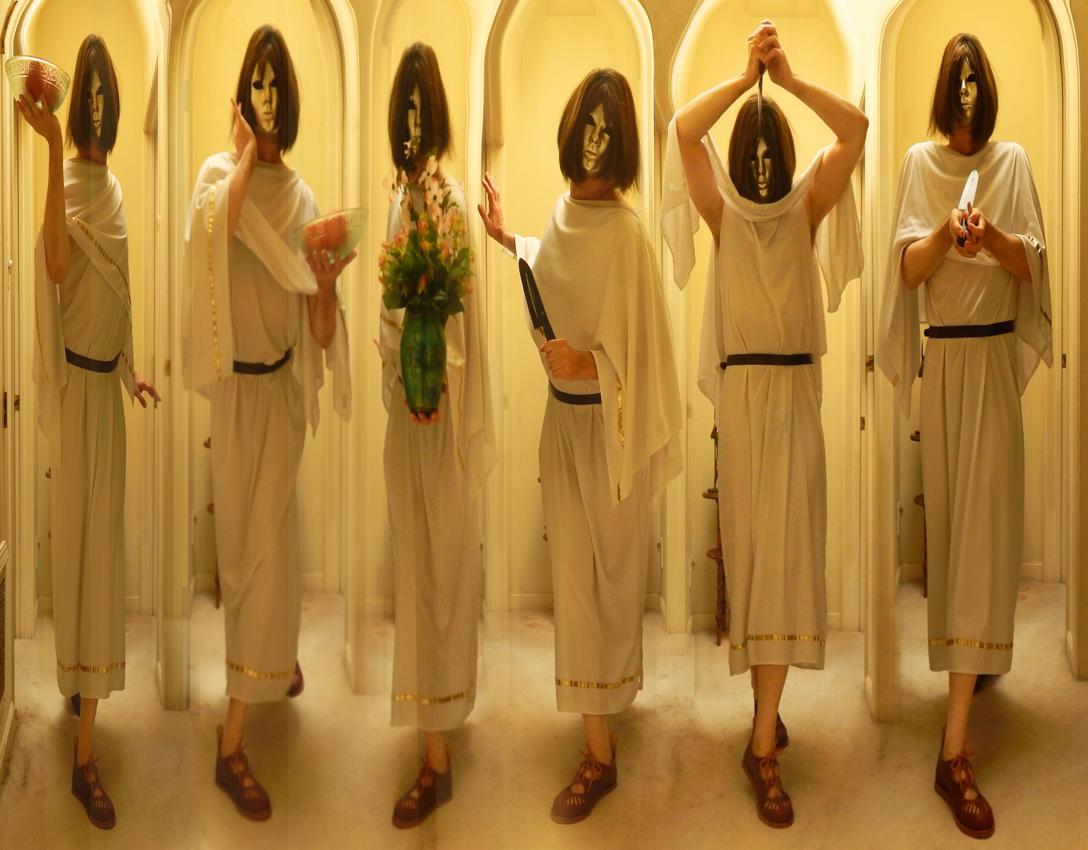 All these qualities of the pyrrhic step, when used in combination, bestowed upon the body an image of intense dramatic complexity and urged the body toward characterization, toward the disclosure of concealed or conflicting identities within the body. It was a mode of movement that co-existed seductively with the display of masks and gorgeous costumes. In fact, the pantomime was not really about the mythic world; it was always about the multiple, theatrical nature of human identity in an imperial political domain. Audiences wanted to see the pantomimes put on and take off the masks, the lavish costumes, all displayed within the performance space. The pantomimes never performed entire stories; they performed only momentous scenes from stories, in succession, montage fashion, because the point of the performance was to reveal the performer’s virtuosity in moving from character to character, from male to female, from mood to mood, from one fate to another.