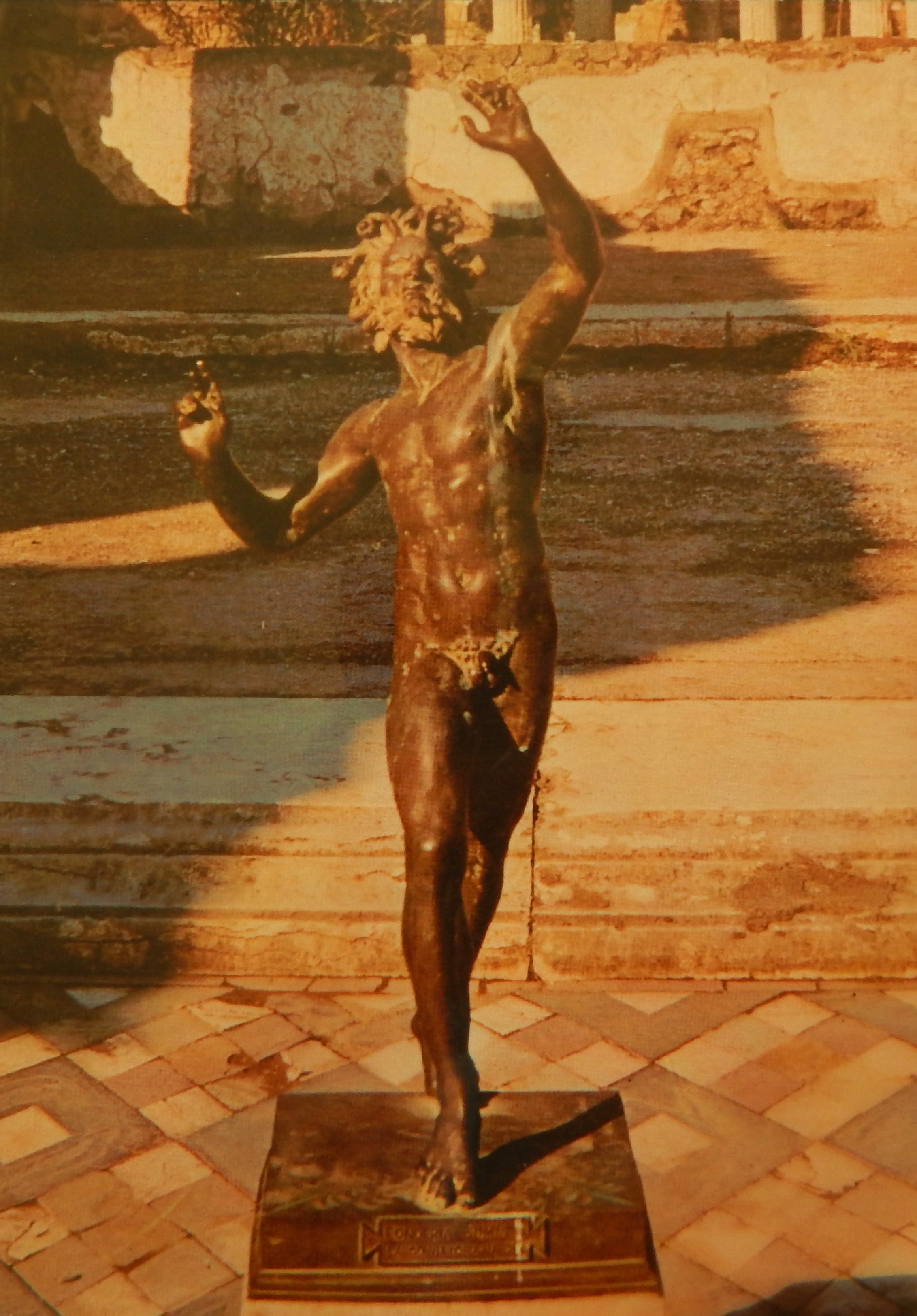 One can move with the soles of the feet flat on the ground to create a mood of stable, assured control over space; or one can move on tip-toes to create a mood of poised, alert, heightened precarious anticipation [Figure 9]. The movement can accommodate a wide range of speeds, tempos, and metrical orders without undermining the martial elegance of the body. The basic step movement also permits the body to accent or amplify rhythms within itself, such as dips, pauses, or curvatures in the vertical axis. The movement is impressive when advancing toward the spectator, when in profile, and even when in reverse (backpedaling). But more significant yet is the power of the movement to develop the expressivity of the upper body. In relation to the vertical axis, the turning or tilting of the head produces a strikingly dramatic tension between the plane of movement and the plane of the performer’s gaze. Such tension further arises with a twisting of the torso at each step or a slinking motion that vaguely contradicts the martial uprightness of the basic position, as in the famous statue of the faun at the House of the Faun in Pompeii [Figure 10]. The pyrrhic step allowed for remarkable flexibility of arm and hand movements, either synchronized with the step or in tension with the rhythm of the step, or with one hand held high and the other held low, and arm and hand movements could shift from exquisite delicacy to startling violence. Another curious feature of the step is its capacity not only to accommodate but to encourage a kind of lilting effect associated with the expression of femininity [Figure 11]. Yet it is a mode of femininity that never seems to prevent the pyrrhic step from maintaining an effect of poised military composure and command over space. It is therefore not altogether bizarre that the pantomimes relied heavily on the pyrrhic step at the same time as they impersonated numerous tragic, mythic women–and the overwhelming majority of star pantomimes were male. Finally, the pyrrhic movement permitted dramatic pivots, smooth transitions to spectacular poses, and an elegant structure for initiating and concluding acrobatic stunts. Indeed, during the Empire, rope dancers fell under the control of the pantomime companies. The rope dance is itself an exaggerated expression of the pyrrhic step, which became thrilling when performed in the circus stadiums, as an interlude between chariot races, without the security of a net. Moreover, the performer danced along a rope that inclined upward from the island in the arena to a higher point in the audience. Item 112, “De funambulo,” in the Anthologia Latina, compiled in Africa around 533 CE, describes this stunt; and anyone who wants to discover how unnatural the pyrrhic step feels to the balance of the body should try walking uphill, one foot in directly in front of the other.