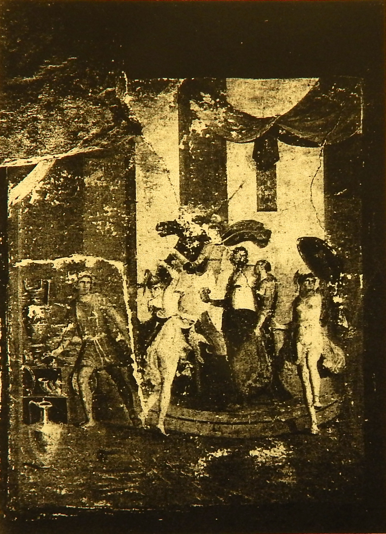 Perhaps the most mysterious costume accessories associated with the pantomimes were masks. Lucian asserted that the pantomime’s “mask itself is most beautiful, and suited to the drama that forms the theme.” But he also insisted that pantomime masks did not look like those used in the performance of spoken tragedies and comedies. The pantomime mask’s “mouth is not wide open, as with tragedy and comedy, but closed, for he has many people who do the shouting in his stead” (Lucian 1936: 241). Yet it is not certain that masks were always part of every pantomime’s performance. Apuleius, in his description of the “Judgment of Paris” pantomime, made no mention of masks worn by any of the many performers in the scene, and other literary commentators on the pantomime avoid explicit reference to masks. Fulminating against the idolatry of the theater, even Tertullian, in De spectaculis (XXIII), treated masking in the pantomime above all as a matter of transvestism (men impersonating women), a worse manifestation of masking than the facial masks of tragic actors in the spoken drama, although he did not explicitly separate pantomimes from the conventional use of masks in performance. In the Porto Maggiore frieze, the figure of Agave holds high a mask designating the head of Pentheus, but she herself appears not to wear a mask [Figure 3]. The mysterious, apparently late Empire silver plate examined by Otto Jahn (1813-1869) appears to depict a pantomimic performance involving the handling of torches by some of the dancers. Masks are displayed but the several performers either do not wear masks or the artist represents the performance as if the spectator cannot distinguish the mask from the performer’s actual face (Jahn 1867: 74-82, Tafel CCXXV) [Figure 30]. Bieber (1961: 231-232), supported by Elia (1965: 177), proposed that a spectacular wall painting at Pompeii, in the House of Pinarius Cerialis, depicted a pantomime representation of the contest between Apollo and Marsyas [Figure 31a]. But although Bieber assumes that masks were a pervasive element of pantomime performance, none of the several figures in the painting, a couple of whom are naked, appears to wear a mask, and the scene does not even contain images of masks as autonomous, decorative symbols, such as appear in so many other paintings. On the other hand, the visual evidence does not seem to reinforce the assertion (e.g., Bieber 1961: 237) that the mimes always performed without masks, for they do wear masks in perhaps the most famous images of them.