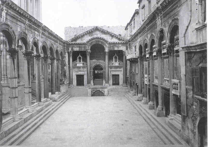 By contrast, the main peristyle of the Villa Poppaea (62 CE) at Oplantis appears designed to accommodate a larger scale of entertainment, although archeological evidence indicates the presence of a large tree in the space. However, the larger space may merely function to accommodate a larger audience rather than a larger performance ensemble. The Villa Poppaea contains another, smaller peristyle, as well as other spaces that could serve pantomime performance on this huge estate, in which the spectacular wall paintings indicate an intense enthusiasm at least for a theatrical domestic environment. A peristyle with some kind of garden would link theatrical performance to plants, water, sky, sunlight—that is, to a “natural” order of things or perhaps to an aristocratic power to cultivate theatrical identities as luxuriously as plants in a garden. The smaller peristyle at Villa Poppaea has a little wall around it, as does the peristyle at the Villa of Mysteries in Pompeii, and these walls would seem to impede effective viewing of performances within these charming, cozy spaces from the colonnade corridors that surround them. Yet a stage or platform set up within the peristyle could elevate the actors in a way that is preferable to having them perform at ground level. But peristyle pantomime performance in the villa milieu did not depend on an atmosphere of luxurious intimacy or cultivated integration with a garden. For example, the peristyle of Diocletian’s palace at Split (ca. 300 CE) apparently made no concession to a penchant for gardening [Figure 58]. While it is unclear if Diocletian or his entourage indulged any appreciation at all for pantomime performance, the configuration nevertheless evokes a highly theatrical atmosphere, with its steps, imperial archways, sculptured facades, and multiple opportunities for dramatic entrances (Wilkes 1986: 41-46). The much smaller peristyle in the Casa di Nettuno e Anfitrite at Herculaneum contains high walls rather than a colonnade, and beautiful mosaics decorate the walls to create a mysterious, cool, submerged atmosphere; indeed, three theatrical masks adorn the top of the shrine-like edifice perpendicular to the famous mosaic of Neptune and Aphrodite. Peristyle performance did not depend on nature, on an elegant garden, to demonstrate the capacity of the pantomime owner to provide his guests with an atmosphere of luxuriousness. Rather, a premium sign of luxuriousness was the ability of a pantomime ensemble to adapt comfortably to different settings. In the villa environment, the pantomime ensemble should impose its glamour on any space assigned to it, just as the organization of pantomime performance, with its discrete mythic scenes, songs, acrobatic interludes, and choral pieces, allowed for the reordering, truncation, expansion, or creation of individual moments to suit the mood, taste, or setting designated by the occasion, the audience, or the villa owner.