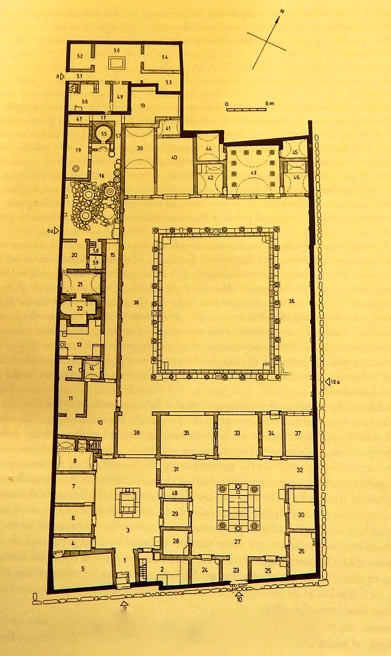 In many villas, the triclinium was a fairly small room consisting of a round or rectangular table surrounded by three, seven, nine, or eleven couches, with each couch sitting one or two persons, although a few villas contained a triclinium with thirteen or fifteen couches. Seating was hierarchical in relation to the status of the host or the guest, if the guest enjoyed a higher status. Some triclinia contain couches of stone that form walls around a well-like space into which the table bearing food rested. But many villas preferred to use furniture couches of elegant design, which allowed the room to be used for other purposes than dining [Figure 59a]. A conventional size for the room was between 4.5 and 7.0 square meters, but larger spaces were feasible; Dunbabin (1991: 128, 130) mentions a villa in Africa (The House of Neptune in Acholla) that was 11.2 by 9.5 meters and another one in Numidia (Djemila) that is 27 meters long. Usually the door to the triclinium opened onto the peristyle to allow for a refreshing view while dining. The conventional seating of diners was to place them in a U-shape around the table bearing the food and facing the door or view onto the peristyle. Villa owners tended to avoid constructing a large triclinium that would seat more than 20 diners; they favored instead the construction of further triclinia, and some villas contained three or four triclinia (Dunbabin 1991: 130).