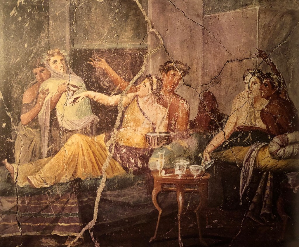 Another candidate as a performance space in the villa environment is the triclinium or dining room. It is not difficult to imagine that wealthy Romans would combine luxurious eating with luxurious entertainment; indeed, in popular mythology, banquets in the Roman Empire seem to require some sort of erotic performance often involving voluptuous dancing and perhaps epitomized by the Bible’s reference (Mark 6:22) to Salome dancing before Herod at his banquet in Judea. In the film Demetrious and the Gladiators (1954), the Empress Messalina (Susan Hayward) entertains the proto-Christian Demetrious (Victor Mature) in her palace triclinium that opens onto a peristyle garden in which eight or so young women in white chitons perform a chorus line dance that is somewhat closer to a Ziegfeld Follies number than to anything resembling ancient Roman choreography. In conventional Christian morality, the triclinium is a useful signifier of the hedonistic “decadence” of either upper class paganism or imperial appetites. While luxurious dining pleasures are invariably features of upper class living, it is nevertheless important to consider the pleasures of the triclinium in relation to basic realities.