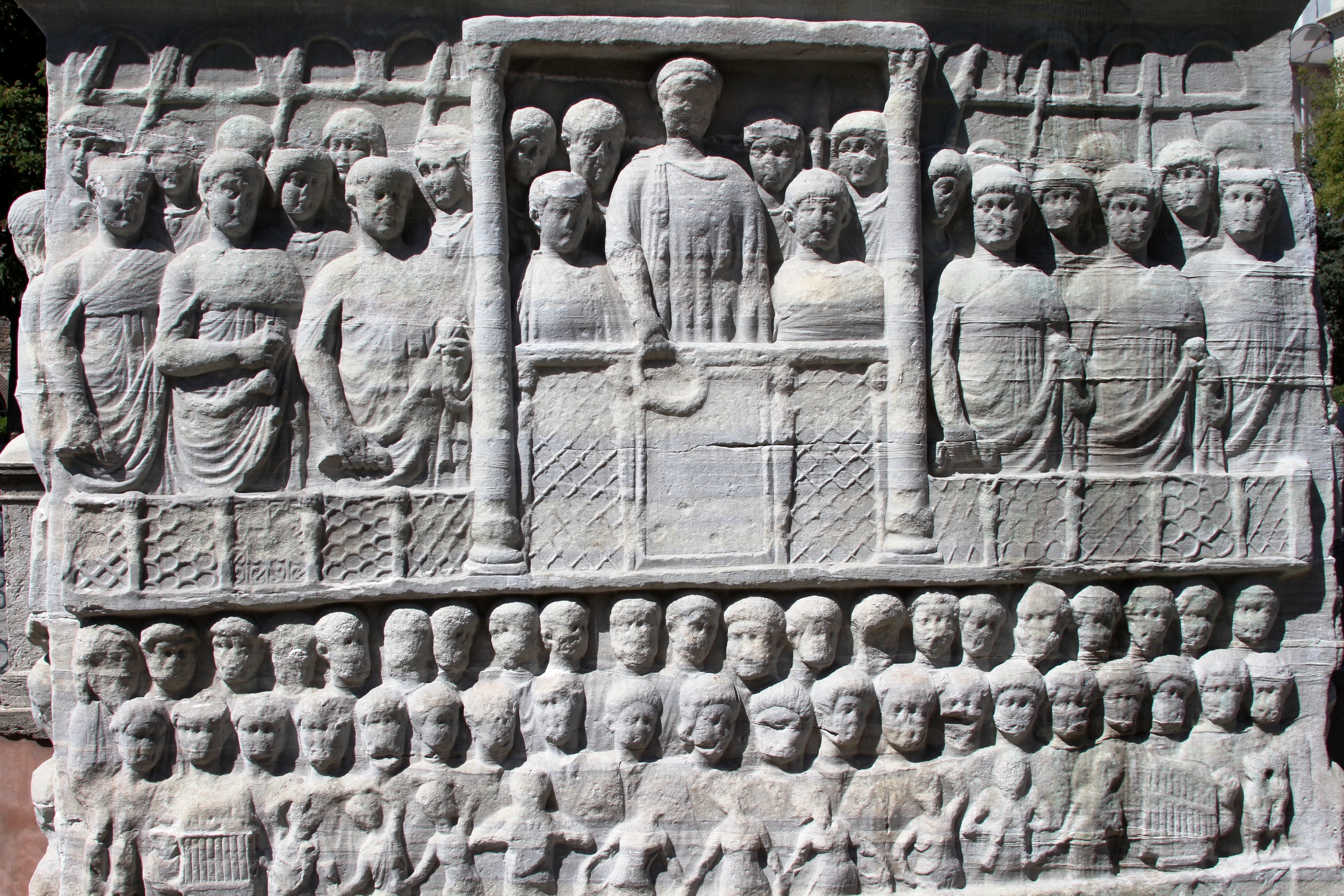 It is also difficult to believe that the big hippodromes in Rome and Constantinople reached their capacity of 150,000 or more spectators week after week. But even if audiences were at 50% of capacity, it is still a very large audience, and it would be to the benefit of factions to remain separated from each other so that the many spectators near them could at least differentiate their chants from the roars emanating from elsewhere in the stadium. Moreover, the dancers on the obelisk panel belonged to the emperor, not to the factions, and so, presumably, they took seats in a lower section under the kathisma. Perhaps they performed a brief dance when the emperor awarded the laurel wreath to the victor. Perhaps their dance after each victory award was part of the interlude entertainment. Perhaps the different movement configurations of the dancers on the obelisk panel indicate that two sets of dancers performed different dances during the interlude on each side of the spina. Whatever the interpretation, the dancers assume an importance in the pedestal commemoration of the emperor that was not granted the pantomimes or possibly even the factions. The dancers in the panel bestow an erotic aura on the Emperor and remind the viewer that he provided not only the chariot races but entertainments in the hippodrome that were just as exciting as the chariots races—not that anyone sitting in the hippodrome could see the figures carved onto the pedestal placed on the spina. (The inscriptions in Latin and Greek on the pedestal refer only to the emperors Theodosius and Proclus, not to any gods, and commemorate them for raising the obelisk.) But audiences saw the procession, and the procession was worth watching from week to week because of the dancers, whose choreographies could vary from performance to performance, guided, probably, by a pantomime. Though it was a routine ritual, the procession would be consistently dramatic, even when the emperor was not in attendance, because it showed the authority of the emperor to make everything move about the great track with power, efficiency, and glamor.