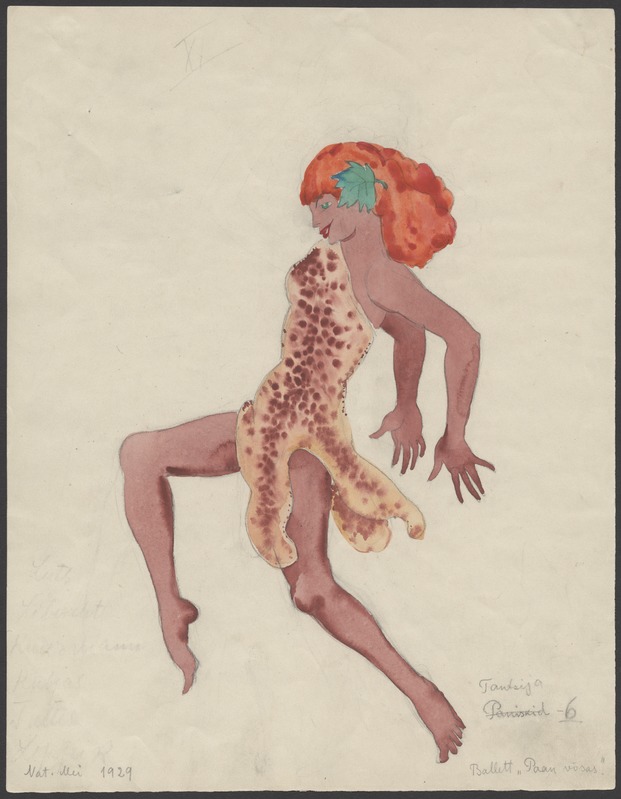 But by 1920, as a result of the Ballet Russes and the Ballet Suedois, the distinction between ballet and pantomime became muddled, even though neither company had a deep interest in pantomime, simply because the companies sought to change the rules of ballet by incorporating modernist visual and sonic dimensions that somehow “compromised” the glorification of movement in itself. In Germany, which had no strong ballet tradition of its own, probably abetted by Wagner’s notorious aversion to dance in opera, the distinction was perhaps even more muddled. In the days before the terms “Ausdruckstanz” and “Freie Tanz” designated modern dance, Germans used a variety of terms to describe the non-balletic artistic theatrical dance for which the country was a major producer: “Tanzpantomime,” “Tanzspiel,” “Tanzdrama,” “Tanzdichtung.” For awhile, Rudolf Laban used the term “Choreodrama,” apparently without knowing that the term had been applied to Viganò’s productions over a hundred years earlier. In 1925, Emil Reznicek (1860-1945) composed a large-scale “Tanz-Sinfonie: Marionetten des Todes,” which had a production at the Dresden Opera in 1927, with choreography and apparently scenario by that connoisseur of luxuriously bizarre dance performance Ellen Petz (1899-1970), who had shifted from ballet to modern dance during the war (cf. Toepfer 1997: 286). The tendency nowadays is to refer to the symphony as “ballet music,” but Reznicek classified the movements of the symphony according to folk dance forms: Polonaise, Csárdás, Ländler, Tarantella, and Petz used the movements to create four “images” of an opulent, aristocratic milieu from the seventeenth century without calling it a ballet, although information about this production, as with all of Petz’s mysterious work, remains maddeningly obscure. Possibly the first to coin a German term for non-balletic art dancing was Otto Julius Bierbaum (1865-1910), with his scenario for Pan im Busch (1899), which he called a “Tanzspiel” or “dance play,” a term used previously, extremely rarely, in an anthropological context to refer to festive dance rituals in folk or non-Western societies. This piece contrasted the amorous adventures of some school children haplessly supervised by a Professor and Governess in a twilight grove with the amorous gamboling of fauns and “panisci” (female fauns) encouraged by the lascivious, flute-playing Pan and his consort Aphrodite. As night falls, the difference between dream and reality dissolves, and a romantic pair who have fallen asleep in the grove become a shepherd and nymph, worshippers of Pan and Aphrodite. But after a storm, the school children return with lanterns: the Professor and Governess forgive the stray students and the piece concludes with a rousing ensemble dance in gallop tempo, with Pan’s head appearing “between the lanterns” (Bierbaum 1900). Pan im Busch combines pantomime with processional movements, poses, and different kinds of dances (round dances, waltzes, polonaise); with its numerous decorative effects, such as the procession of lanterns, an inundation of rose petals, and Aphrodite in white chiton, gold sandals, and gold ornaments, the piece resembles an erotic festival pageant or a hothouse erotic ceremony. It is certainly not a ballet. Bierbaum sought to engage Richard Strauss to write the music, for Strauss was always looking for opportunities to compose for the theater. But he didn’t see one in Bierbaum’s scenario (Heisler 2009: 38-39). So Bierbaum’s friend, the Wagnerian conductor Felix Mottl (1856-1911), wrote the orchestral score, and the work had a production at the Karlsruhe Opera in March 1900 that employed such a densely lush forest setting that it is difficult to see how any kind of dancing could take place on the stage (Bühne und Welt v.2 pt.2 1900: 624; Draheim 2004: 109). But this odd work managed to have another production thirty years later, in Tallinn, Estonia. At the Estonia Theater, Rahel Olbrei (1898-1984), the opera ballet director, staged the piece in December 1929 using both actors and dancers and an expressionist set designed by Aleksander Tuurand (1888-1936) that provided space for dancing, although critics complained that the dances went on too long and with too much “bustle.” Olbrei took a more blatantly erotic approach to the scenario than the Karlsruhe production by stressing voluptuous movements, lifts, and poses. But the acting succeeded more than the dancing, which combined ballet with German modern dance. The ballet company was only three years old, and Olbrei was struggling to build a reliable, distinctive unit with the limited talent and resources available to her. A “Tanzspiel” seemed a way to disguise these limitations, but the critic Henrik Visnapuu (1890-1951) warned that “dance pantomime,” as he called it, required as much talent as ballet and was by implication not a term to which one should attach lowered artistic expectations (Leis 2006: 31; Einasto 2018: 129-131).