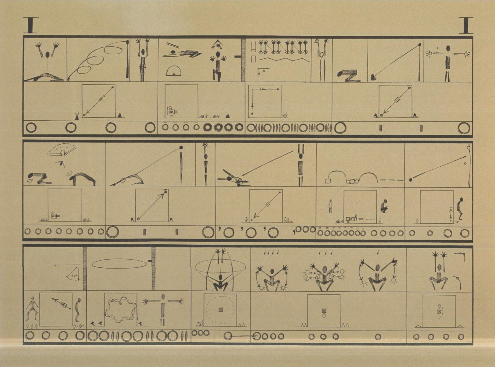 But Schulz’s artistic ambitions urged her to choose Holdt over Schreyer in shaping her performance aesthetic. Schreyer left for the Bauhaus, while Schulz and Holdt continued on their own in Hamburg. For Schulz, expressionism was no longer a power to construct an allegorical abstraction of human identity or a mystical “inner” condition; it was the power to transform human identity into an utterly alien form, a bizarre mutation, a grotesque species, sometimes insectoid, sometimes robotic, sometimes as if the performer’s body came from another world altogether. The wild costumes that she designed and Holdt built out of discarded materials certainly formed the strange identities of the creatures they created for the stage (Nuñez 2006: 56-63) [Figure 138]. But unlike Schreyer with his idol-like figures, Schulz was not content to let the expressionist costume design reveal the strangeness of the simplest human movements: she wanted a unique, ideologically informed movement to emerge from the costumes. She and Holdt befriended the young composer and musicologist Hans Heinz Stuckenschmidt (1901-1988), who played in a nightclub trio with Holdt. Stuckenschmidt began composing music for the “masked dancing pair,” and this music consisted mostly of modernistic adaptations of the jazz and vaudeville tunes he performed in the nightclubs. Schulz and Holdt repudiated Schreyer’s Christian mysticism, for they regarded Christianity as a source of ecological degradation and diseased morality; instead, they followed their own, utterly personal ideology derived from Nordic myth, the Edda, an “Aryan” heritage of hardship, struggle against elemental strain on the body, and austere transcendence of physical and economic adversity (Chadzis 1998: 84-86). While they were never as constricting as Schreyer’s costume designs, the costumes constructed by Schulz and Holdt used materials—wood, metal, glass, canvas, heavy cloth—which made the movements of the performer stressful, perhaps even painful. The idea was to dramatize a primal conflict between the body and that which protects it and bestows identity upon what one might call its owner, although Schulz and Holdt approached this struggle with grotesque, perverse humor. They came up with bizarre names for the characters/costumes they invented: Springvieh, Technik, Bertchen, Bibo, Toboggan, Tote Frau. Each character entailed a unique movement style. Schulz and scholars of her work refer to her performance pieces as “dances,” but Schulz did not organize the pieces around steps or around any system of movement that would define the pieces as dances. She devised elaborate, cryptic notation maps for describing the movements of characters in the pieces, which were either solos or duets she performed with Holdt [Figure 139]. She used a different notation map for each piece, which makes it difficult to see how she employed a larger system of movement, even of her own invention, to create dances instead of pantomimes. Each costume/character represented for her a different notion of struggle between the body and the strange identity imposed upon it. She even sketched out plans for a “dance film” involving Springvieh and Toboggan and recognizably human figures (Chadzis 2006: 27).