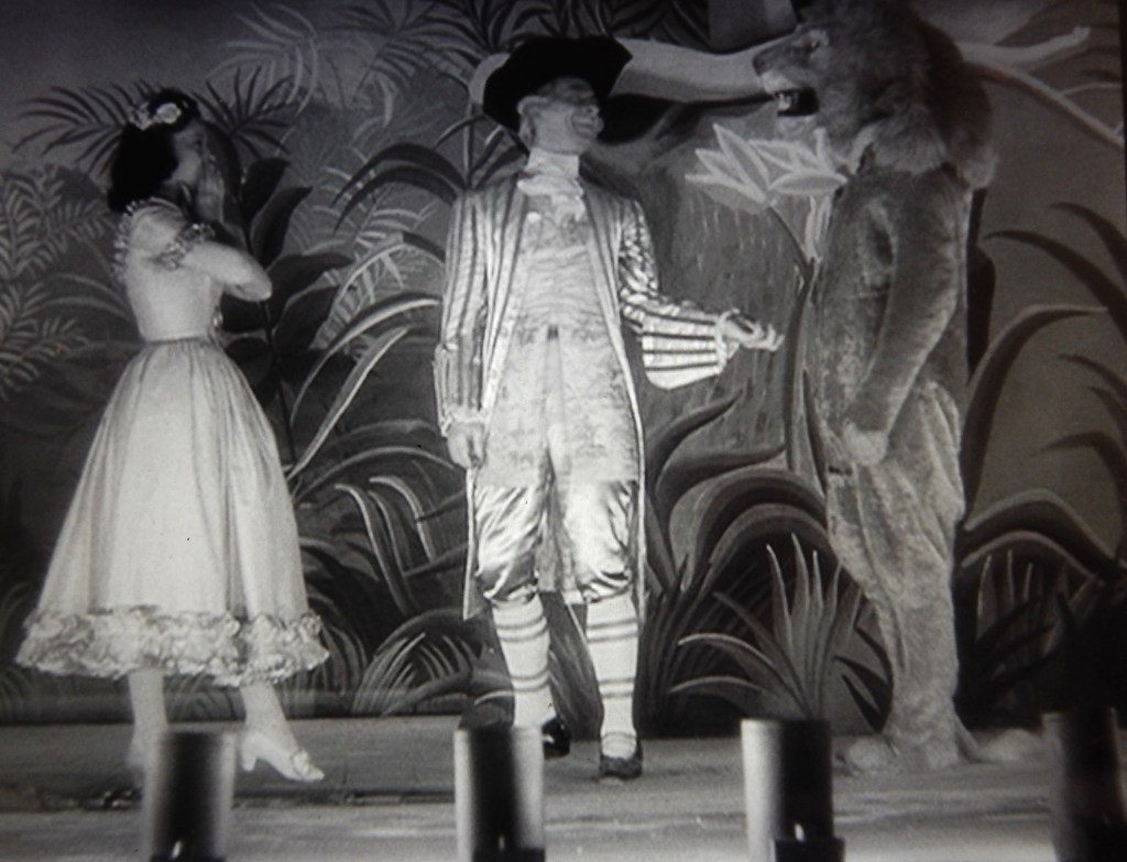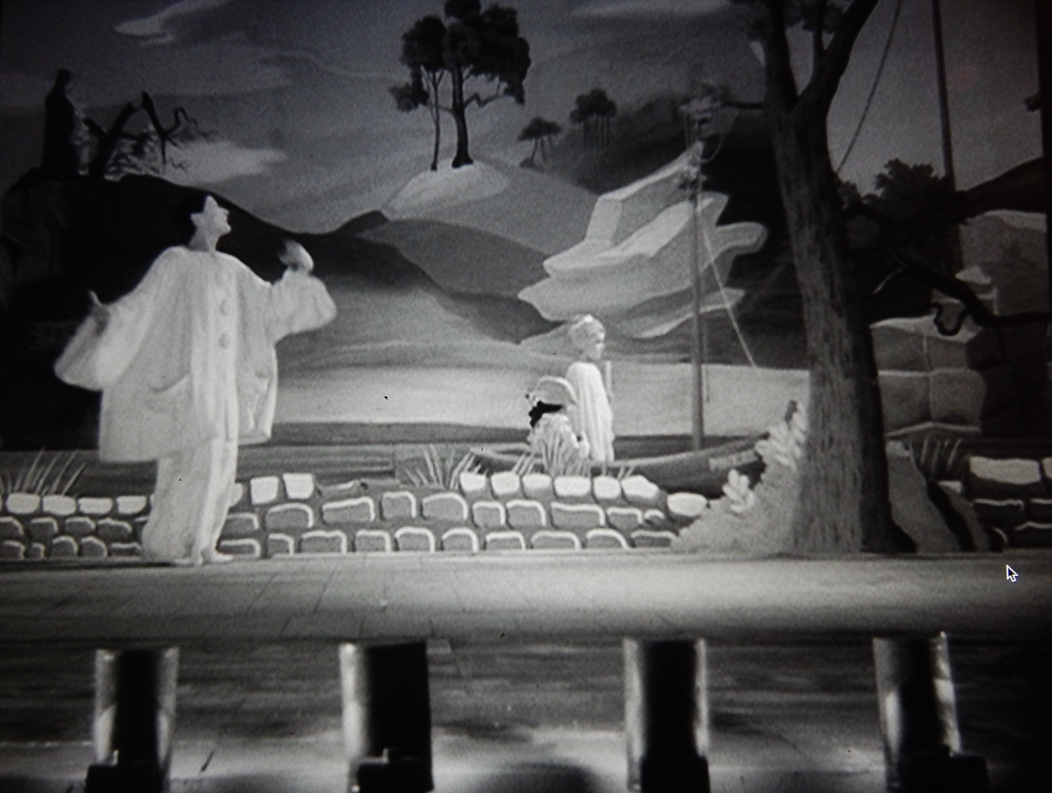Film Still Series A: Scenes from Marcel Carné’s Les enfants du paradis (1944-1945). 1) Pantomime scene at the Funambules Theatre, with Nathalie (Maria Casares), Anselm Deburau (Etienne Decroux), and unidentified actor in lion’s costume. 2) Pantomime scene with Pierrot (Jean-Louis Barrault) falling in love with the statue of an ideal woman (Arletty). 3) In pantomime, Pierrot sees his ideal woman sail away with Harlequin (Pierre Brasseur). 4) Pierrot holds up the wash for Colombine (Maria Casares) with the rope by which he intended to hang himself. 5) Baptiste crosses out his Pierrot image in the mirror when he realizes that Garance cannot love him as he desires. 6) In the Marchand d’habits pantomime, Pierrot’s love for the ideal woman makes him vicious when he has no money to buy nice clothes to gain entry to the party where his love awaits; so he steals the clothes seller’s sword and stabs him. 7) Offstage, Pierrot usurps or effaces Baptiste as the center of domestic life. 8) In portraying Baptiste offstage, Jean-Louis Barrault’s performance is much more restrained physically than when he portrays Pierrot in the pantomimes on stage. Except when he takes a sword to the huge bouquet of flowers Count de Montray has given Garance, Baptist appears as a quiet, introspective, melancholic figure defined by his alluring economy of gesture. 9) Much of Baptiste’s character, as opposed to Pierrot’s characters, Carné and Barrault reveal through luminous close ups of greater emotional resonance and subtlety than any of the exaggerated actions performed by Pierrot in the Funambules pantomimes. The film was of immense importance in creating the “mime culture” of the 1950s to the 1980s, but it was Barrault’s romantic performance as Baptiste rather than his performance as Pierrot in the Funambules pantomimes that drove the enthusiasm for mime. 10) The Funambules pantomime performance with audience as imagined by Carné and art directors Léon Barsacq and Raymond Gabutti. Photos: Carné (2002).