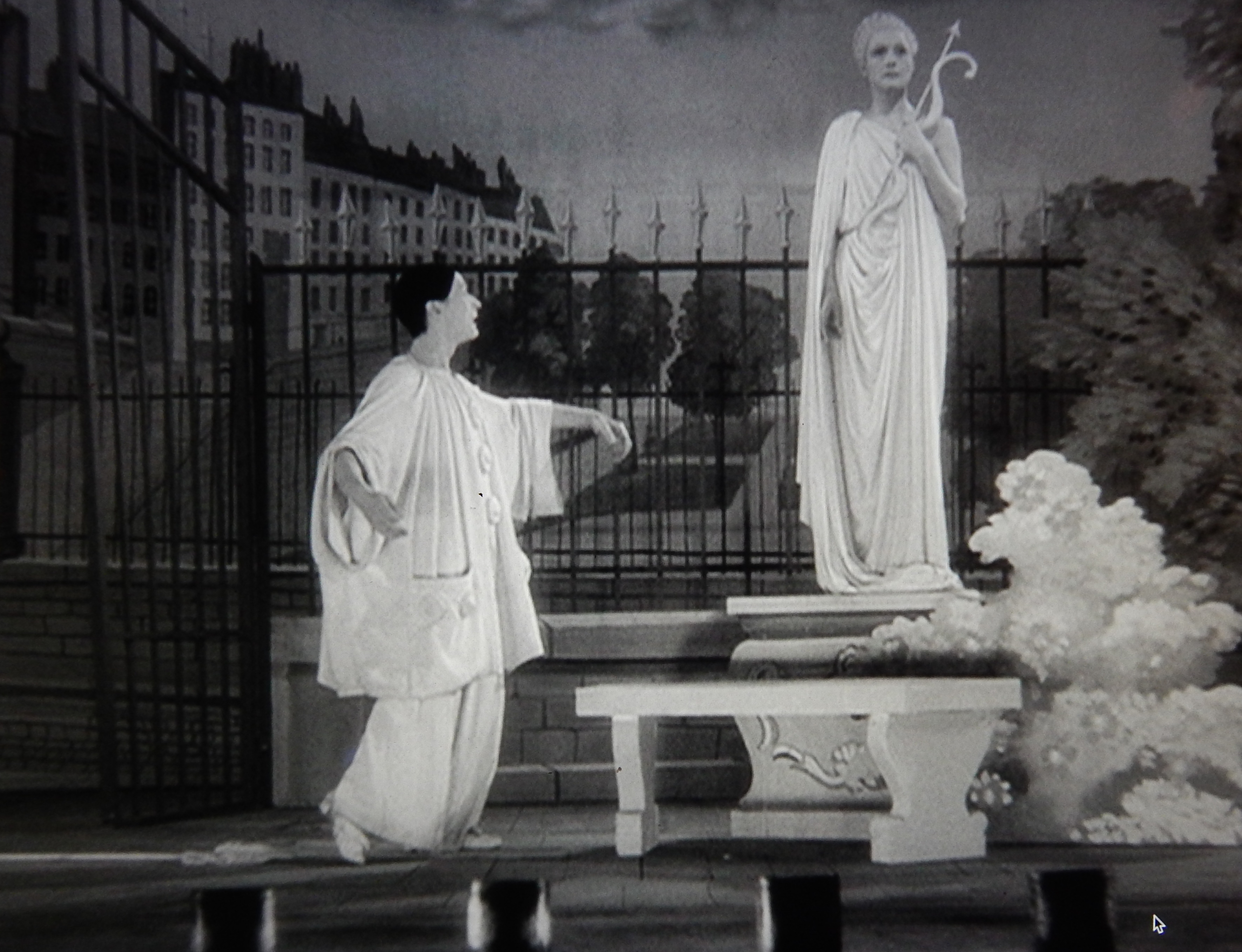 The second pantomime occurs somewhat later, after Baptiste has become a star. This time he wears the typical white Pierrot costume with huge sleeves, huge buttons, billowing pants, and the black skullcap. The rather modernistic painted scenery depicts a city street with the statue of a goddess (Garance). Pierrot becomes enamored of the goddess, although a police officer (Anselme) enters and discourages his unwholesome attraction to the statue [See Film Series A below]. Pierrot retrieves a bouquet of roses that he offers in vain to the immobile goddess. Depressed, he falls asleep beside the statue. Harlequin (Lemaitre) appears, picks up the roses, and offers them to the goddess, who comes alive, floats down to him, and accepts the roses as he guides her away. When the policeman awakens him, Pierrot becomes distraught to see that the goddess has disappeared, and he dives off the stage. The curtain falls only to rise almost immediately. The scenery now depicts a drab countryside. Pierrot sees the beautiful woman with Harlequin in a boat gliding past him on the river. He longs for her, but she vanishes beyond his impotent, tormented reach. He decides to kill himself with a rope, but as he prepares to hang himself from a tree, a little girl appears and asks to use his rope to skip rope. When he retrieves the rope from the girl, a woman, played by Nathalie, appears and asks to use the rope to hang laundry with Pierrot holding one end of the rope. While holding the rope, Baptiste sees Garance chatting intimately with the harlequin Lemaitre in the wings, which causes him to freeze with jealousy and Nathalie to cry out in alarm: “Baptiste!” a violation of the law that forbids pantomime theaters from uttering anything on stage. Backstage, Nathalie explains to her father, the manager, that Baptiste has changed, that he is “lost,” and that only she can see his “torment,” because she loves him. The pantomimic scene represents only a tiny fragment of pantomimic action that the Funambules would have presented in a show, yet the scene is not in itself particularly interesting. What is interesting is how the film shows characters outside the pantomimic scene intruding upon the lives of the characters in the pantomimic scene: from his box, the Count de Montray (Louis Salou [1902-1948]) sees Garance and becomes infatuated with her; Lemaitre and Garance in the wings disturb the performance and partnership of Baptiste and Nathalie. In costume backstage, Baptiste expresses gentle, quiet concern for Nathalie’s “distress,” while she confides that she has “faith” that someday he will love her. In costume backstage, Lemaitre and Garance discuss their dying relationship: neither is happy with the other, and in her sleep, Lemaitre observes, she calls out “Baptiste!” As he leaves her dressing room, de Montray enters, bringing with him an enormous wreath and proposing to her, using grandiosely flattering euphemistic language, that she become his mistress. While changing from her goddess costume into her street dress, she explains that her life is fine as it is, but she accepts his card, which proves useful when dealing with the police again, who suspect her of having conspired with Lacenaire to commit another crime. When the Count leaves, Baptiste enters, still in costume. He treats the wreath as a symbol of his own funeral, which is better than a wedding for a groom without a bride. The memory of his happiness when he danced with her in the tavern and escorted her to the hotel room he found for her never leaves him. He dances momentarily and sadly with himself, then draws a sword from a prop rack and hacks violently at the wreath, confessing his hatred of the Count, Lemaitre, and himself. Garance asks why he assumes she does not love him. But Nathalie enters; she declares that Garance does not love him, only she loves him, no one else can love him, and no one else can break the invincible truth that she and Baptiste belong to each other. The point here is that the pantomime performance extends beyond the stage to include a drama that no single character can see as completely as the action on the stage. This drama bestows a power on pantomime that is really not in the pantomime performance itself, which consists almost entirely of simple, childlike, exaggerated gestures whose “poetic” quality rests upon the assumption that no one would perform them except on a stage the characters explicitly say has “changed” them. As a result, the pantomime performance on stage appears much simpler and less sustainable than the dramatic and much more subtle performances that unfold before the camera off stage. The film propagates the idea of pantomime as a “poetic” or romantic art, but this idea depends on the cinematic representation of Baptiste, for example, carrying the Pierrot image into dramatic scenes off the stage in which he performs bodily movements of a far greater refinement and subtlety while also speaking.