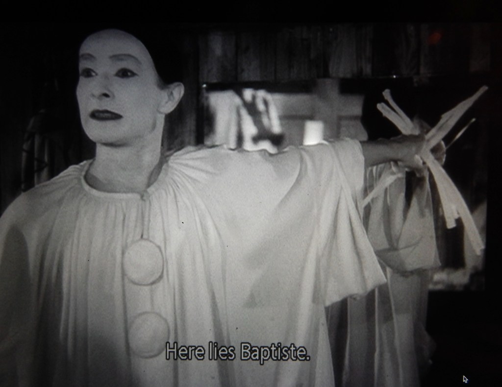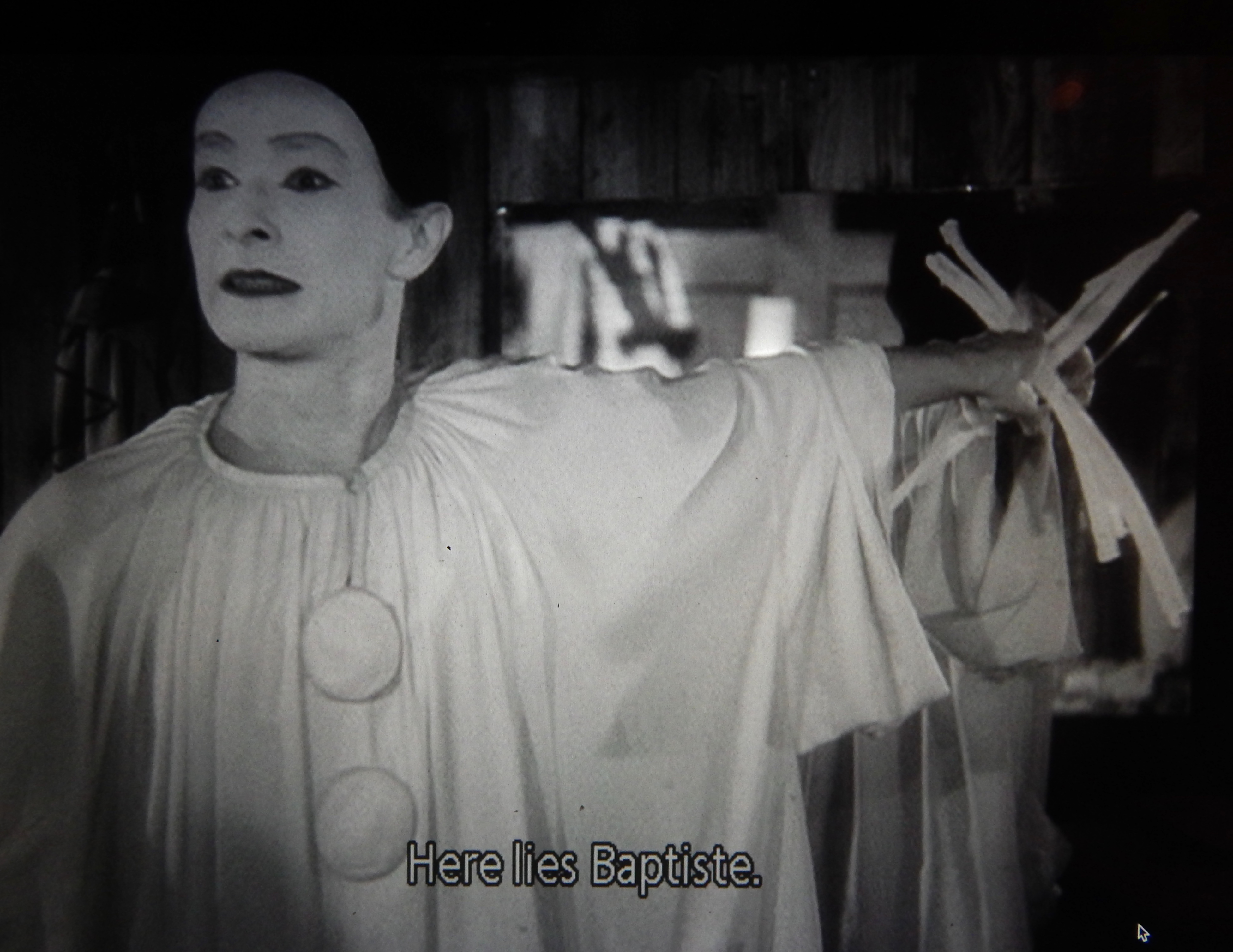 The film presents three scenes in which Baptiste performs pantomime. In all three scenes, he enacts the figure of a “white” Pierrot. The first scene, however, which introduces the character of Baptiste, takes place in the street before the theater and presents a proto-Pierre. Anselme Deburau addresses the crowd and invites people to attend the theater. He introduces his son, Baptiste, sitting before the crowd, as “someone you will not see on stage,” for Baptiste is a “know-nothing, a dolt, a sleepwalker, an unbelievable nincompoop, a blockhead, a good-for-nothing, a famous father’s despair” whom the father clubs on the head. Baptiste sits forlornly, as if catatonic. Instead of the typical Pierrot white pajama costume with large buttons and a black skullcap, Baptiste wears a white waistcoat, a white vest, white baggy pants, a large, floppy white hat, and long blond hair, although he paints his face close to that of the typical Pierrot. While Anselme speaks to the audience, Baptiste sees Lacenaire steal a watch from a man watching the presentation. Anselme goes into the theater, leaving Baptiste alone on the street stage. When the man discovers that his watch is stolen, he accuses Garance, standing next to him, of having stolen it. The police arrive and seize Garance, but Baptiste intervenes and demonstrates through comical pantomime how Lacenaire stole the watch. The police release Garance, which inspires the audience to cheer exuberantly the skill of the pantomimist. The pantomime is unusual in that in reconstructing the crime Baptiste impersonates, with caricatured gestures, the man with the watch, the thief, and Garance. Garance thanks Baptiste by giving him a flower and blowing him a kiss as she wanders away, which inspires the smiling Baptiste to see in her the great love of his life. But this scene also establishes Baptiste as a superior pantomime artist who replaces his abusive father on the stage of the Funambules. In contrast to the other ambitious male characters in the film, who love to talk in a poetic, philosophical, aphoristic, literary manner, Baptiste embodies ambition as a “silent” phenomenon, as a thing unspoken, undeclared but merely manifested through a gesture, a movement, a glance, a posture that others cannot perform so well or so “poetically.”