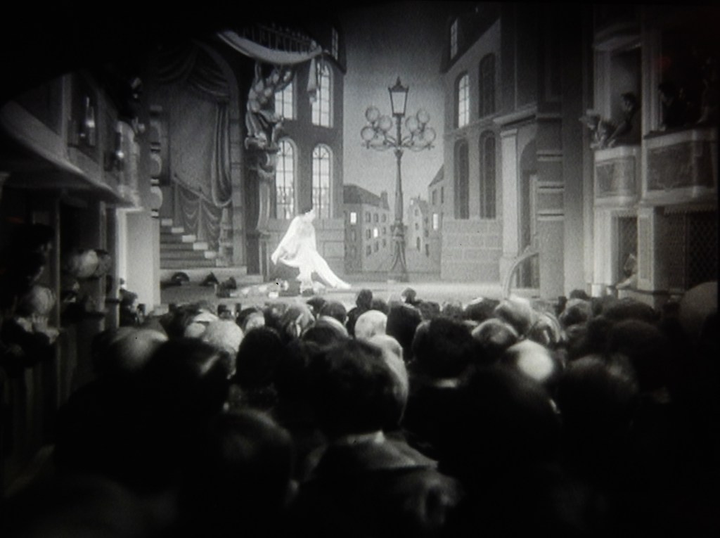 The third pantomime occurs several years later, after Garance has returned from Scotland and watches nightly, from her private box, the pantomime performances at the Funambules. This pantomime is a heavily abbreviated version of the old Le Marchand d’habits scenario from 1842.The scenery here is handsomer, more costly, indicating a rise in the fortunes of the theater and of Baptiste. At night, a luxurious carriage, pulled by a mechanical horse, glides across the stage, with Pierrot stealing a ride on the rear bumper. An elegant, aristocratic woman, the Duchess, played by Nathalie, descends from the carriage and ascends the steps admitting entrance to an opulent mansion. Through a window, the spectator can see the silhouettes of couples dancing. Pierrot hops off the carriage as it pulls away and, in his white pajama costume and skullcap, jauntily struts toward the mansion entrance. But a pair of guards blocks him and then tosses him on his butt, causing a great roar of laughter from the “gods,” the “children of paradise,” the crowd in the cheap seats of the top balcony. The dejected Pierrot signifies his unhappiness at having the wrong costume to gain entrance to the ball. He dances momentarily with himself, emulating the dancing silhouetttes in the window. He then hears the call of an itinerant clothes merchant bearing a rack of secondhand garments. Leaping exuberantly, Pierrot prances around the merchant, who tosses him a pair of items. But when the merchant extends his hand for payment, Pierrot plunges his hand into a big pocket and comes up empty. The merchant tussles the clothes from Pierrot and moves away. Pierrot draws a sword from the merchant’s scabbard and stalks him with a chilling intensity, causing Garance in her box to remark to Lemaitre: “He is gentleness itself. How does he manage to look so cruel?” Pierrot plunges the sword into the merchant, elegantly watches him fall, leaps over the body, and gathers up the clothes he wanted. He stealthily tiptoes away with large steps as the curtain falls. But the film intercuts the pantomime performance with scenes of Garance talking with Lemaitre in her box, where the production manager has escorted the actor, who wears his arm in a sling as a result of his duel with the author he insulted on stage. The dialogue between these two updates the viewer on Garance’s life over the past few years, then drifts toward other themes: Baptiste’s “marvelous” artistry, her current non-happiness, Lemaitre’s jealousy over Garance’s persistent love for Baptiste, his willingness to inform Baptiste of Garance’s desire to see him during her brief stay in Paris, and his realization that his jealousy has now enabled him to play Othello. Backstage during the intermission, many things happen that effect the performance of the pantomime on stage. Lemaitre and Baptiste meet after many years and praise each other’s success as theater artists. They join Baptiste’s wife, Nathalie. The actor praises Nathalie for her beauty, though Nathalie says she is not beautiful but happy. Lemaitre also meets the couple’s young son. The insidious ragpicker Jericho (Pierre Renoir [1885-1952]) arrives, urging Baptiste to move away in disgust with Lemaitre. An informant, a spreader of malignant gossip, and dealer in contraband goods, Jericho complains to the stage manager about Baptiste “murdering” him every night in the pantomime and then complains that his sad fate is to inspire no one’s love. He informs Nathalie of Garance’s presence in Box 7, and she sends her little son to the box to inform Garance that his family is very happy, the implication being that Garance should stay away from Baptiste. As Baptiste in the wings prepares to go back on stage, Lemaitre reveals that Garance is watching the show and would like to see him again. The pantomime resumes inside the ballroom of the mansion with many couples waltzing and the Duchess (Nathalie) at the center. The Duchess drops her fan, which is the cue for Baptiste, in his new toreador-like costume but retaining his skullcap, to sweep onto the stage and retrieve it. He takes a position to dance with the Duchess, but freezes, thinking of Garance. In tight close up, Baptiste, with a memorable expression of painful renunciation, turns his white face away from the frightened Nathalie. He rushes off stage, abruptly terminating the performance and arousing dismay from the audience. He goes to Garance’s box, but she has gone. In a subsequent scene, Baptiste broods in the hotel room where he first declared his love for Garance. When the concierge brings him supper, she suggests that he cure his depression by attending a performance of Lemaitre’s Othello. It is during the intermission of the play that Baptiste and Garance run into each other, observed by Lacenaire, who turns the rendezvous into a humiliating “scandal” for de Montray and himself. Here, more than in the rope pantomime, the actions of characters outside of the pantomime overwhelm the action on stage and even destroy it. Pantomime seems too fragile to absorb or even to survive the “passions” of those who perform or watch it, although the same might also be said of Lemaitre’s bombastic performance as Othello. Pantomime mobilizes the passions of the characters without representing the passions beyond a perfunctory, stereotypical set of gestures. This is not a weakness of the film, for which pantomime is merely a sign of a “poetic” spirit that actually conceals what only the film can see: the destructive interlinking of real and simulated passions. Barrault performs Pierrot masterfully, but as Baptiste outside of Pierrot, he is powerfully captivating, his speech exquisitely economical (compared with nearly everyone else), his movements elegant, precise, delicate, cautious, his smile, his gaze, even a slight turn of his head or a shift of his eyes, all seem like the inflections of a sublimely gifted artist who brings a