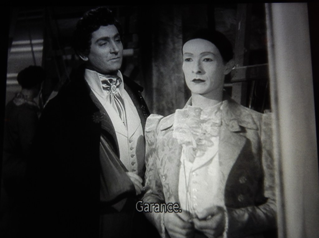 The film projects a powerful romantic grandeur, but a tragic logic drives the narrative: for the main characters, love never achieves fulfillment, reciprocation, or even happiness that is more than of the utmost brevity. The only love that seems enduring and mutual is that exchanged between the actors and their audience (“the children of paradise”). As Lemaitre explains to Lacenaire (Marcel Herrand [1897-1953]), when the criminal visits the actor in his apartment with the idea of extorting money from the man he thinks has robbed him of Garance: “To hear and feel your heart beat at the same time as the audience” is what makes acting “the finest” profession. Theater here mobilizes “passions” in the characters and brings them into contact with each other. The performances on the stage do not “mirror” the life of the film characters. Rather, they represent a “poetic” life that the characters seek to intrude upon and assert themselves as “authors” of it, a point made most humorously by Lemaitre when in the performance of a bad melodrama, he ceases to speak the lines written for his character and begins improvising a critique of the play, leaving the stage altogether and assuming the position of spectator in a loge, from which he addresses the audience and the actors with his extravagant criticisms. Pantomime is the most “poetic” form of theater insofar as it creates “more love”—that is, it awakens the love of Garance and Baptiste for each other and Nathalie’s love for Baptiste, whereas the other men, who disdain pantomime, only desire Garance, who loves none of them. Lemaitre, played by Pierre Brasseur (1905-1972), gets his start in the theater by performing small roles in Baptiste’s pantomimes, but he feels profoundly stifled by not being able to speak with the bombast and grandiosity that come more naturally to him than from the authors of plays: “I’m dying of silence!” Prévert, however, was reluctant to write the screenplay because of his aversion to pantomime, and he agreed only after Barrault said that he and Decroux, who played Baptiste’s father in the film, would supervise all the pantomime scenes, which they did with the help of Georges Wague (Turk 1989: 220). Yet Baptiste is more than the role he plays on stage, and indeed, his love for Garance is an expression of a doomed desire to escape that role.
