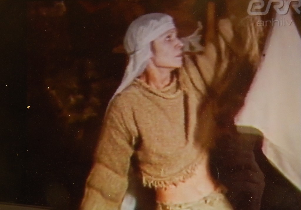 Figure 176: Top: Scene from the “Wreath Ballad” section of Mimeskid (Mimesques), directed by Kalle Kurg, Vanemuine Theater Tartu, Estonia, 1981, with Maret Kristal, Sirre Oengo, Mare Tommingas, Jelena Tšaulina. Photo: FOTIS, Rahvusarhiivi. Bottom: Maret Kristal in Sanctus, performed in the Kiek in de Kök, Tallinn, 1989, left: as pagan woman, right, as Christian woman with wimple. Photos: from “Torninäitus” video directed by Tiina Pork in ERR Arhiiv.