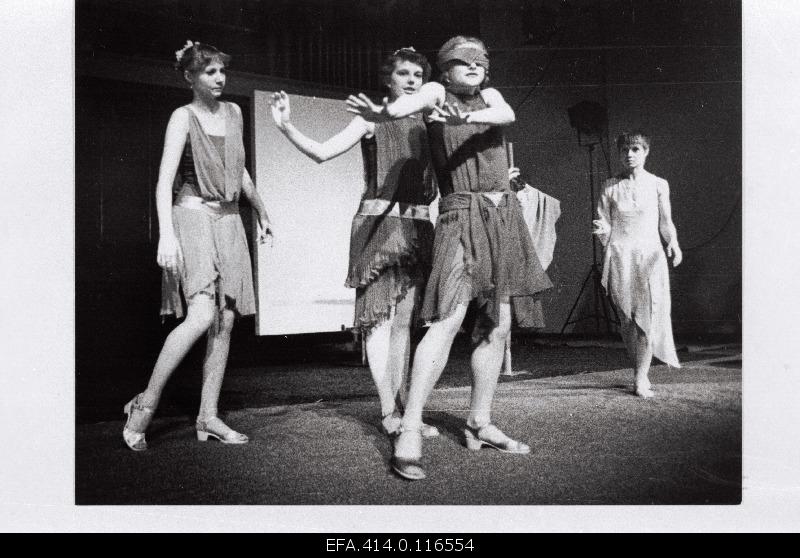 The first piece, Light (music: Grünberg), depicted a woman leading a blind man from darkness into light. She seeks to restore his trust in his “inner light,” which will allow him to overcome his fear of becoming lost in darkness, though he also fears finding the light, for light destroys as much as it gives. They become separated and try to find each other in the darkness. But he is able to approach “absolute light,” which enables him to restore trust between himself and darkness. The pair are able to go forward. The piece incorporated interesting lighting effects. When the woman was apart from the blind man, a soft light fell on her, but when they were together a hard spotlight shone on them. In the second piece, Wreath Ballad (music: Sumera), a girl, in a costume made to look like moss, weaves a wreath. Three sisters approach her and invite her to play with them. But the game soon turns violent and becomes a struggle for power with the goal of “dancing somebody to death.” “Heaven crashes and swallows everything.” The lyrical movements of the moss girl contrasted with the rigid, mechanical movements of the deadly sisters (Kristal Archive 1981, 2017). A photo in the Rahvusarhiiv (EFA 414 0-116554) of the piece shows the three sisters wearing chiton-like dresses in different colors and contemporary feminine footwear, although the moss chiton worn by the wreath girl, who here appears blindfolded, looks distinctly poorer than the sisters’ dresses. Mari Kurismaa (b. 1956) designed the costumes. But it is evident that Kristal and Kurg wished to depart from the barefoot and body stocking aesthetic that prevailed with Traks, Ligers, and Tenisons. The final piece, generally regarded as the strongest, was The Flight of a Migrating Bird (music: Grünberg), which showed the hatching of a bird from out of nothingness, out of an invisible egg. The bird discovers a “frightening but inviting world.” The hatchling grows into a bird and struggles to raise herself into the air. A storm or “unspeakable invasion” approaches, which compels the bird to surge upward until finally she succeeds in flying into a great black emptiness. Blackness attaches to her body, but she pushes forward, pushes away the darkness until she reaches the a clear, white sky. It is an existential drama revealing the symbiotic relation between freedom and inevitability (Kristal Archive 1981), although Kurg had originally planned a darker ending, which, however, he felt might exacerbate his difficulties with Party cultural officials. A lighting technician told Kurg that it was possible to project onto the dark background a patch of blue light, which would then present on the stage the blue, black, and white colors of the Estonian flag. Though this effect had nothing to do with the scenario, it did bestow a coded political significance on the story of moving from darkness to a liberating radiance. With the help of an architect (Harri Lindemann) and a technical director (Rein Randväli [1951-1985]),Kurg designed rotating disks or “islands of light” for each piece, and each disk contained a light and could move across the stage and above it; for The Flight of a Migrating Bird, the disk contained a light within it and rotated to simulate flight when the performer lay upon it, as if moving in the air. Kurg described Mimesques as a kinetic visual experience, and he regarded the disks as “somewhat like ‘characters’” in the performance (Kurg 2020). The program attracted large and enthusiastic audiences, and played for two seasons at the Vanemuine Theater, before touring in Kaunas, Lithuania and Leningrad (1982), Belgium and Finland (1989). The program won first prize at the Moscow International Pantomime Festival in 1985. A graduate student, Anne Dieme, made (1985) a film of Mimesques, which appeared in theaters and then on Estonian television.