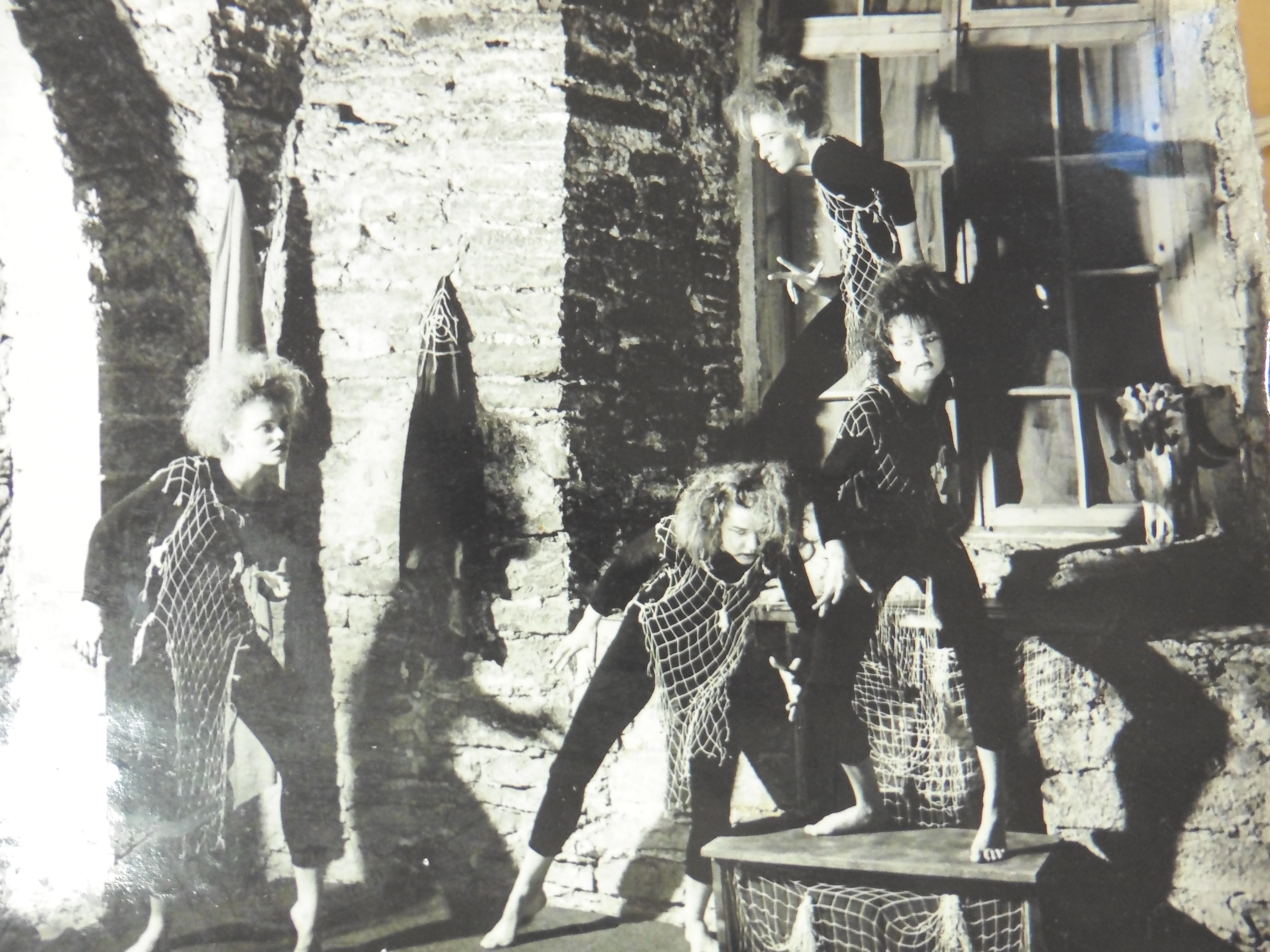 The Tallinn Pantomime was a smaller ensemble than the Pantomime Studio. The productions of the group contained three to five named performers, although over its ten-year existence, the ensemble had a total of eleven performers, of whom nine were women. Performances most often took place in the ruins of the Dominican monastery in the Old Town section of Tallinn. The first production, Contrasts, occurred in 1979 and consisted of a series of earlier “miniatures” revived by Traks. Subsequent productions, however, Traks classified as dramas, tragi-comedy, or tragedy and constructed a single narrative. Legend of Love (1980), a drama in three scenes, “begins with a religious ritual, lead by a shaman with a drum, and directing people into the Netherworld. The cult the people perform requires unconditional surrender, affirms loyalty and promises courage—all in order to ensure a successful hunt. A young hunter runs forward and after a while kills a magic deer [elk]—an act that gives freedom to a beautiful young woman who had been trapped in the body of the deer. The hunter and the woman fall in love. But again we hear the drums, referring this time to approaching hunters for whom mercy for the hunted is absolutely unknown. The hunter is caught between his love and his religion. But it is only after the bloody sacrifice of his beloved that he rejects his religion” (Einasto 2002: 2-3). The printed program notes by Traks summarized the theme as “Love hiding within cruelty” (Traks Archive 1982). The accompanying music was by conservative Russian composer Oleg Khromushin (1927-2003). Anti-Human (1981), was a tragi-comedy in three “metaphors,” with five women performing all the roles and “fragments of modern music” accompanying the action. According to the printed program, the first “metaphor” depicted “hypocrisy as lying,” while the second metaphor “spoofed human vanity, greed, grief, envy, and aggression.” The final metaphor presented “indifference as superstition.” The piece exuded an aura of medieval allegory, with bodies or movements representing concepts like Hypocrisy, Greed, or Superstition. The ensemble presented a revised version of Legend of Love in 1982, although it is not clear how the new version differed from the old. Death Bell (1983) was a tragedy in three scenes, with music by the English rock band Pink Floyd. According to Traks’ philosophical rhetoric in the printed program, the three scenes, Longing, Lust for Life, and Despair, showed how “love protects humanity,” and how the “loss of love is irreparable.” The “most intense happiness produces the greatest sensitivity to pain.” “Life is a bad teacher, without mercy, without compassion.” The piece thus reveals “the tragedy of unborn love” and yet also the inability to “escape love’s grasp.” But how the ensemble transformed these grandiose ideas into physical actions eludes description in the available documentation. A photograph from the production shows five barefoot performers in white, gray, and black body stockings with capes posing dramatically in the monastery ruins, as if all the characters are challenging each other, wary of each other (Traks Archive 1983: ETMM T438). With music by French radical modernist Olivier Messiaen (1908-1992), Eksinu (1984), roughly translated as The One Who Is Lost, was a tragedy concerning a Woman whose conscience deserts her at a crucial moment of her life. She commits a crime, evidently the murder of a child, and then “the power of the soul” returns and resolves a fundamental “contradiction” within her. Three other women appeared in the piece representing either aspects of the Woman or the society from which she has become estranged. The tragedy was that, “There is only a too-late wisdom: reality has ruined everything human.” The piece was also unusual in that the Woman wore a medieval costume with a white veil covering her head (Traks Archive 1984: ETMM T438). Soul Sickness (or Cellar Spiders) (1985), a “drama,” featured four women performers and a montage of electronic music arranged by Arno Kivisikk (b. 1953). A newspaper story inspired the piece, which concerned the enticement and assimilation of a new member into a criminal gang that hangs out in a sinister cellar. The theme was the “morals of young people, the evil that gives birth to violence, insolence, a disdainful attitude toward public order, and egocentrism.” The barefoot girl gang wore punk hairstyles, black body suits, and serapes made to look like spider webs (Traks Archive 1985: ETMM T438) [Figure 175]. The ensemble’s last production, Conflictus (1986), another drama, also featured an all-female cast of three with music by minimalist Estonian composer René Eespere (b. 1953). In his typically existential rhetoric, Traks described the piece as “the encounter of the Human Being with the Human Soul. Conflictus is the concept of being in the human world, evolving through patience and love, while animal passions plunge the Human into the chaos of the soul. Full of pain is the path where the Human’s constant companion is Death. […] The Human develops through suffering and love.” He explained that the scenario arose out of improvisations with the actors to get them each to discover a unique pantomimic representation of emotions (Traks Archive 1986).