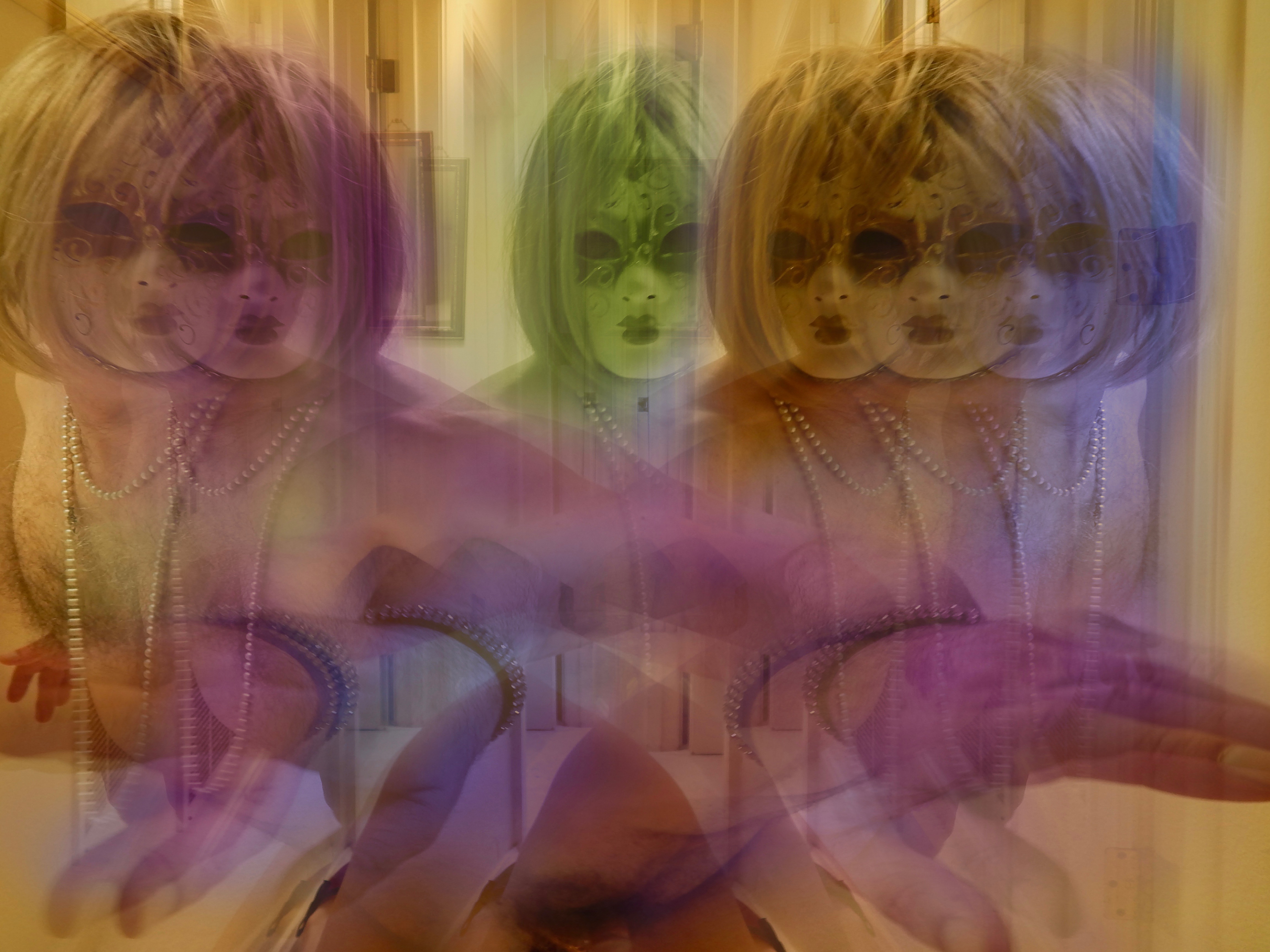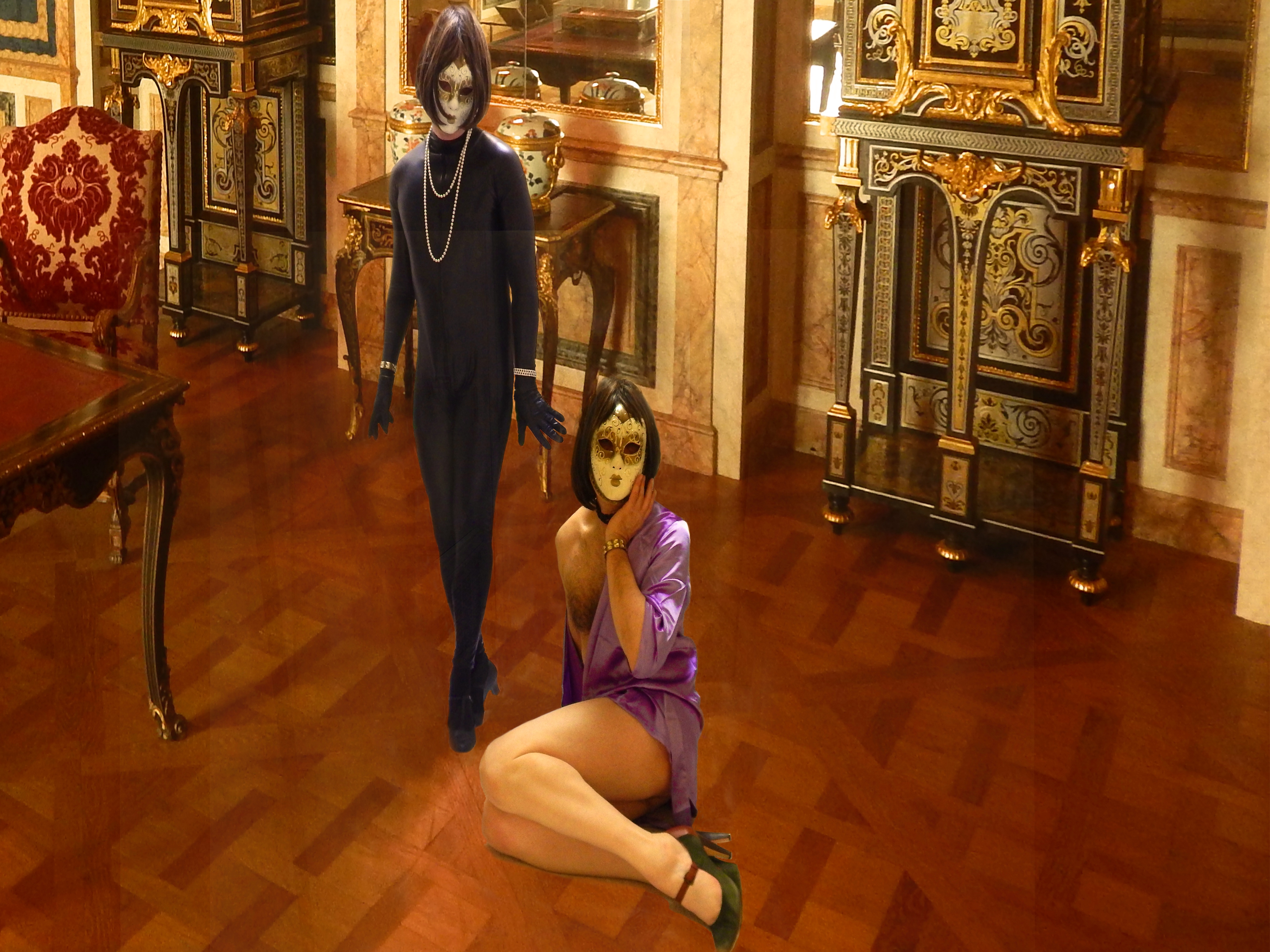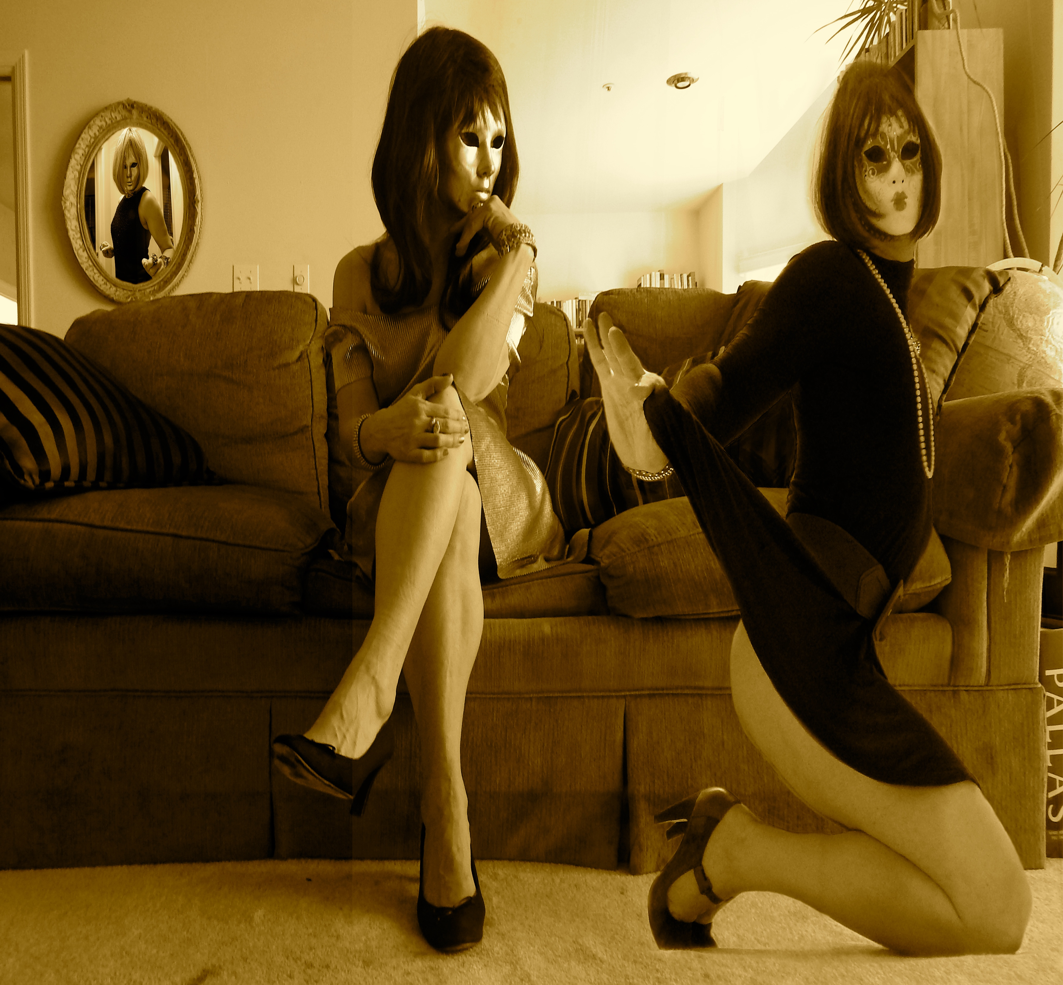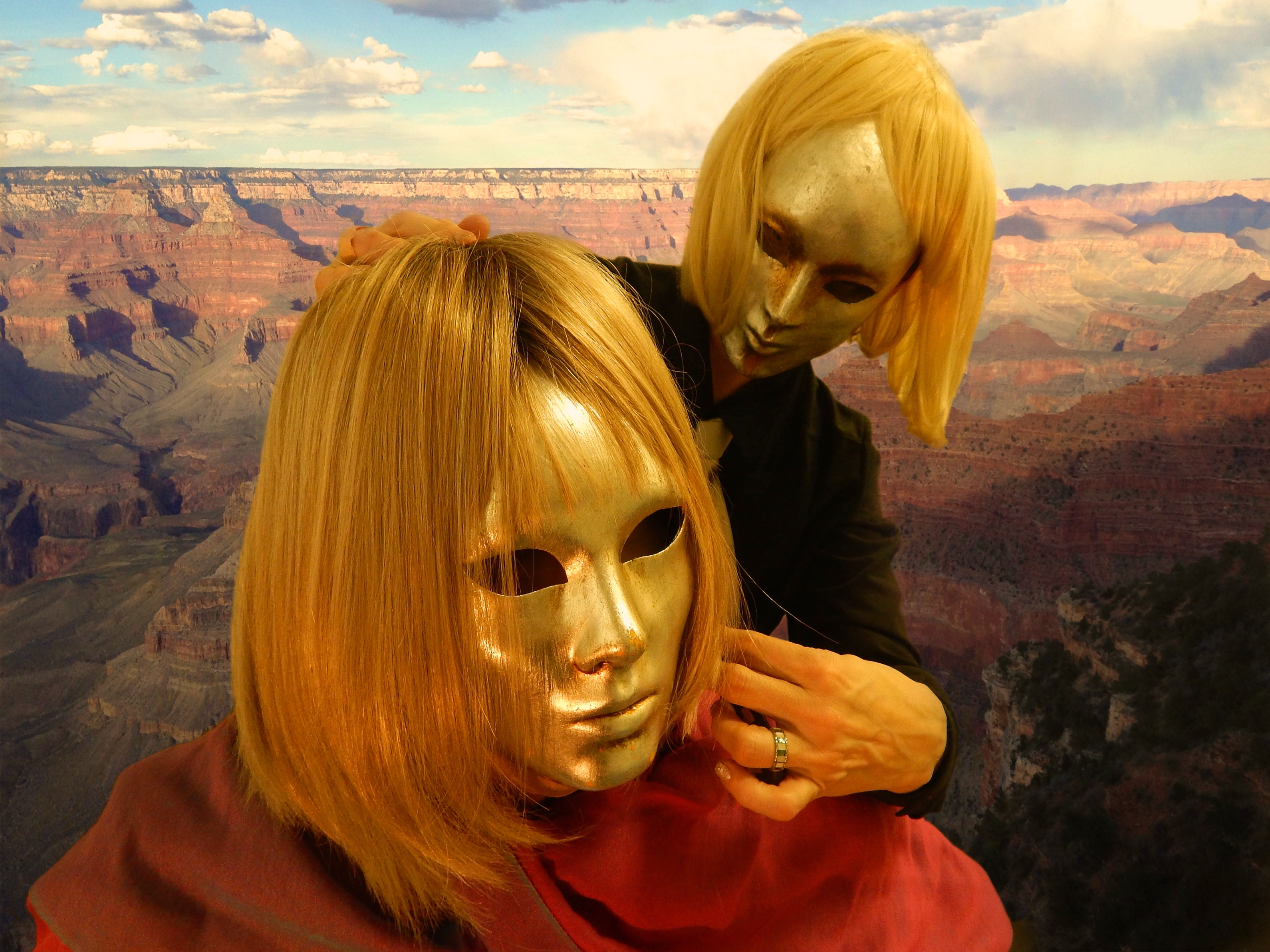Many images in “The Masks of Femininity” are composites created using Photoshop. Composites allow figures photographed in one context to appear in an entirely different context. They allow one to reimagine the environments in which sexual identities may appear and to construct scenes that are otherwise difficult or even impossible to photograph. Compositing greatly expands the imaginative reach of photography. Some photographers, especially those of a photo-journalistic or even fine arts background, complain that compositing undermines the credibility of photography to document “reality”; compositing undermines “trust” in the photographic image. But no photograph is ever a completely trustworthy recording of a “reality” outside of the image; it is always made as a result of social-cultural pressures controlling what the photographer sees and how to see it. Compositing reminds us that the image is its own reality, that it is an illusion to believe that a photographic image ever completely or even mostly reveals a reality outside of itself and the pressures that caused it to exist.