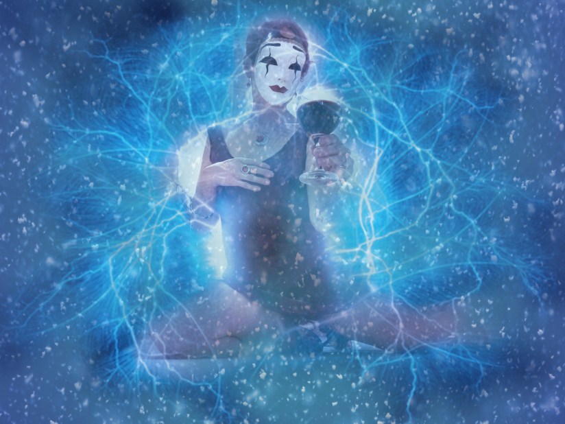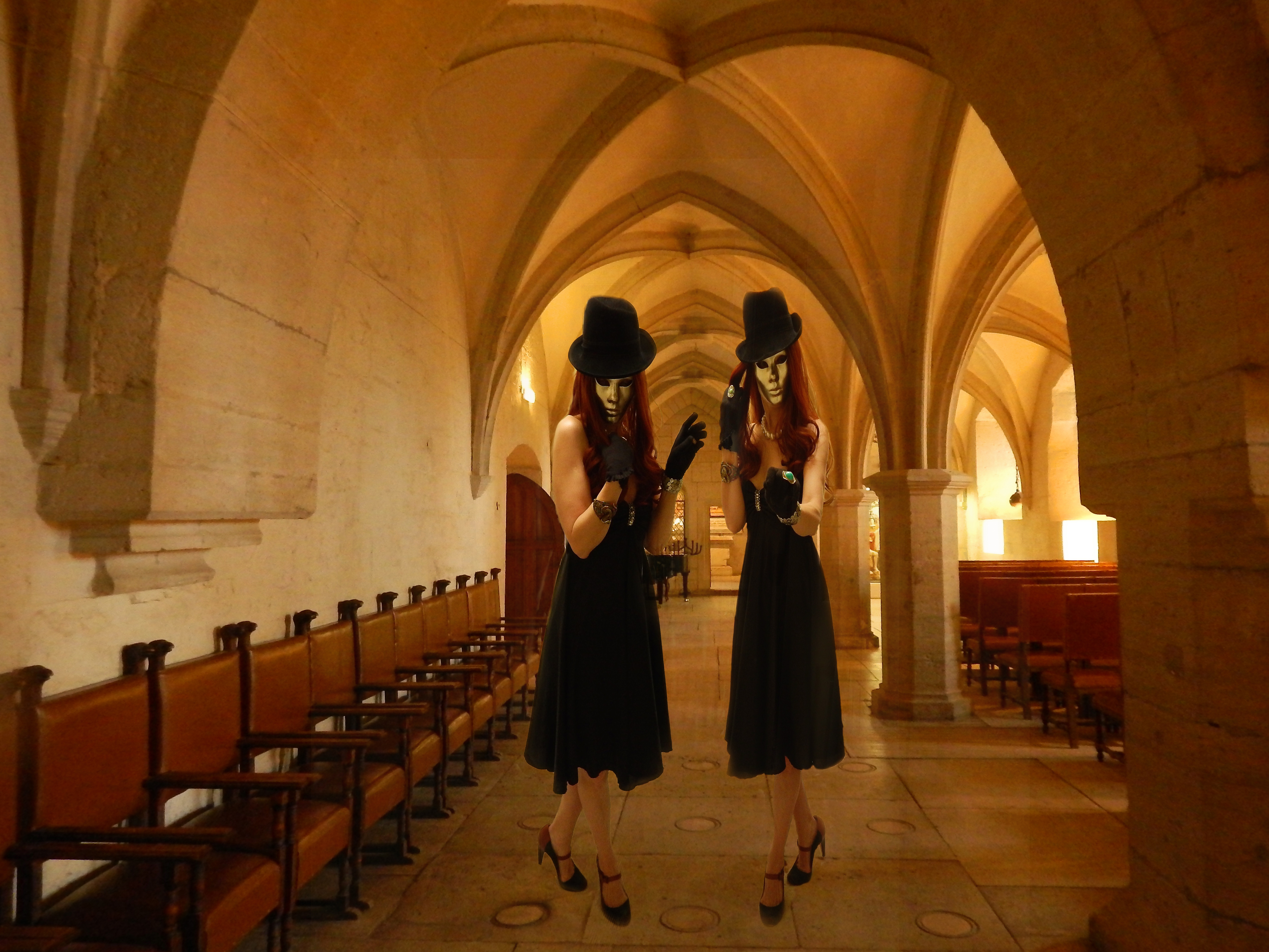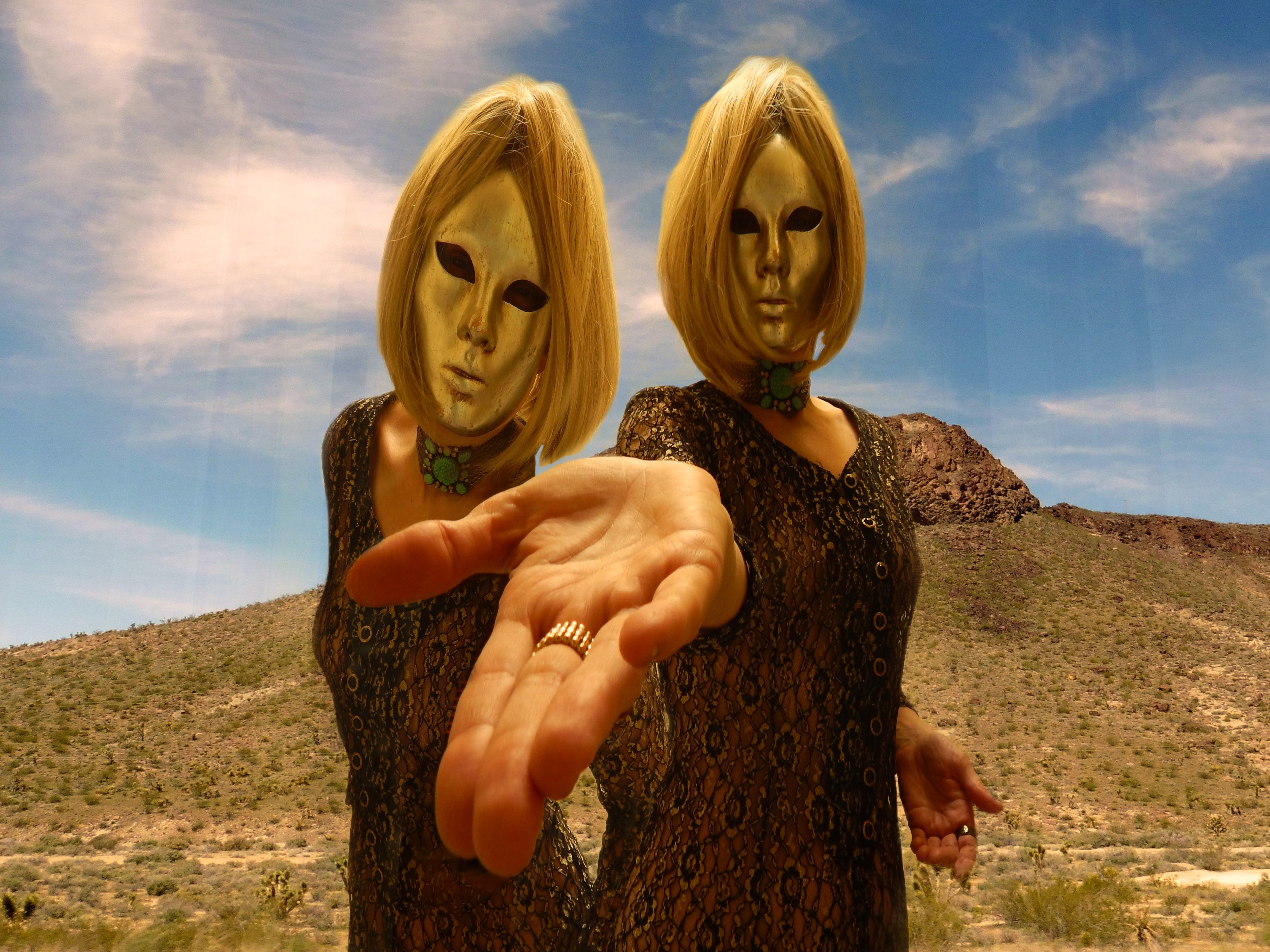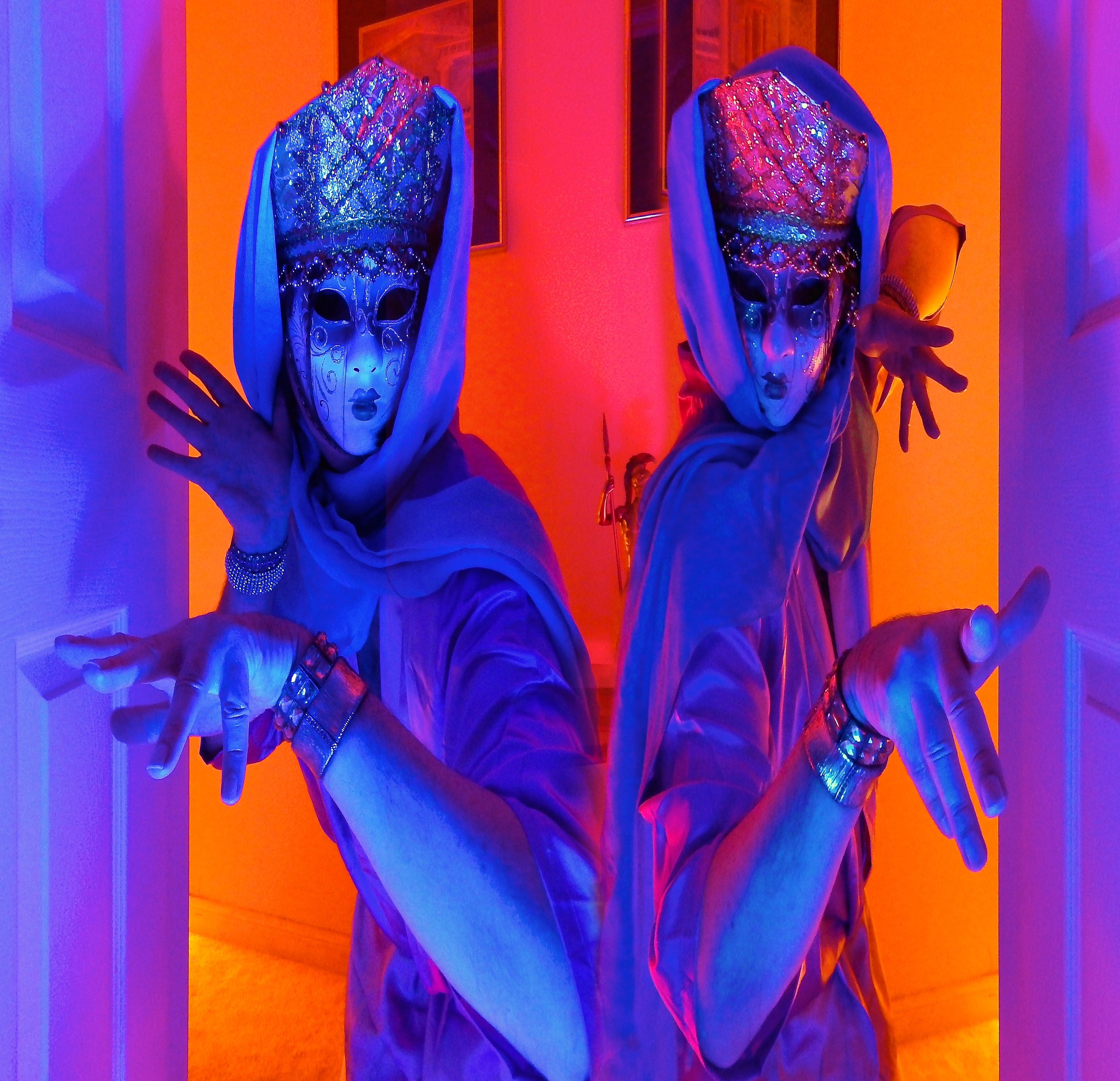 This composite series combines different photographs of the same body, mask, and costume to create the illusion of twins in the image.